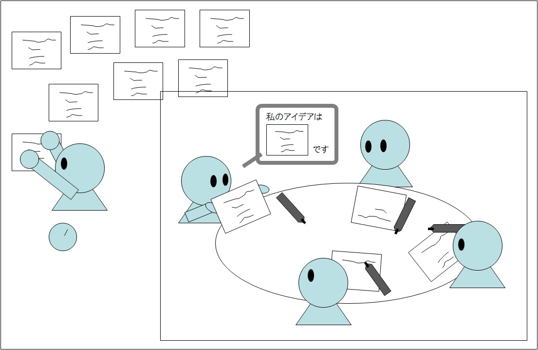 また、先に重鎮メンバーがアイデアを出すとそれになびきやすくなる場でも、各自書いてしまったがアイデアが存在しているので、それぞれのオリジナルな意見を引きや出しやすくなります。この方法もアイデアが紙に残るので、とても良い方法です。