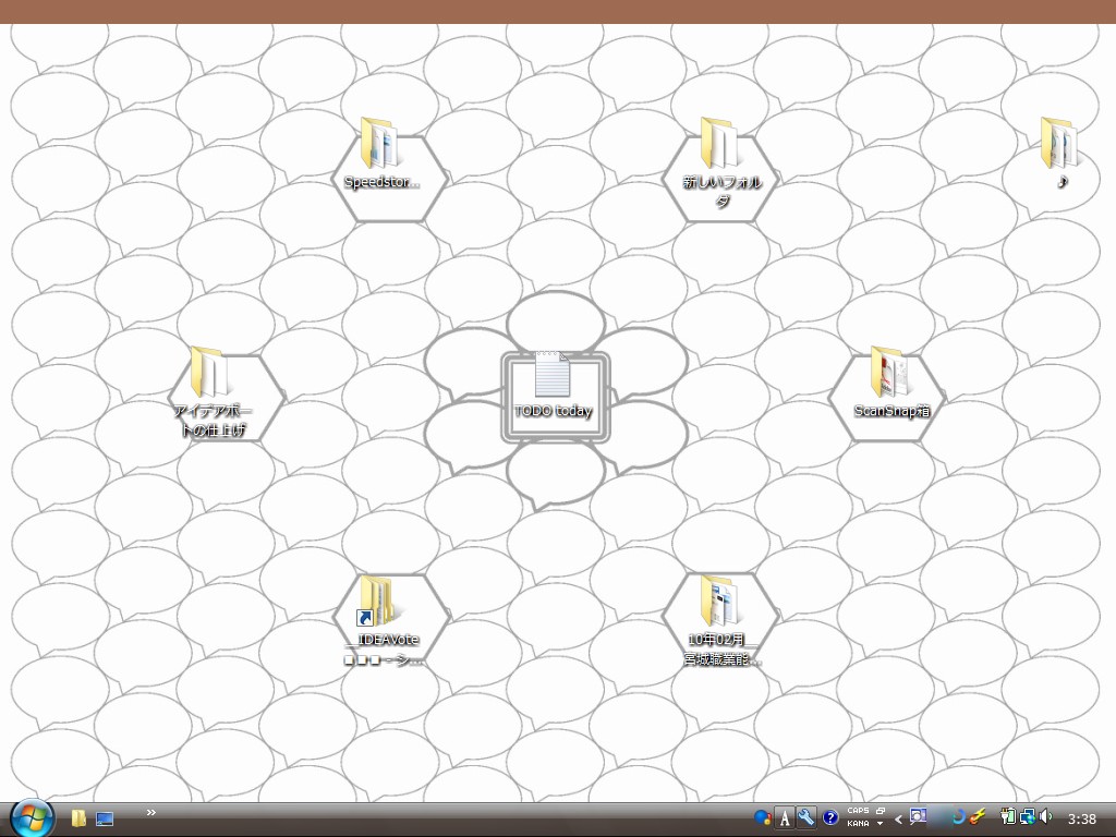 2010.02.10 アイデアプラント 2nd (2009-2011) はちのすノート、別の使い方拙著、アイデア・スイッチで、紹介した”発想専用ノート”「はちのすノート」は、こんな感じに、一風変わったデスクトップとしても使えます。 上記のような感じで、デスクトップ上のフォルダやファイルに、ちょっとボードゲームの「カタン」風なたのしさを醸すことが出来ます。 « 加藤昌治さんの年賀状 ビジネス誌「THE21」に載りました。 »