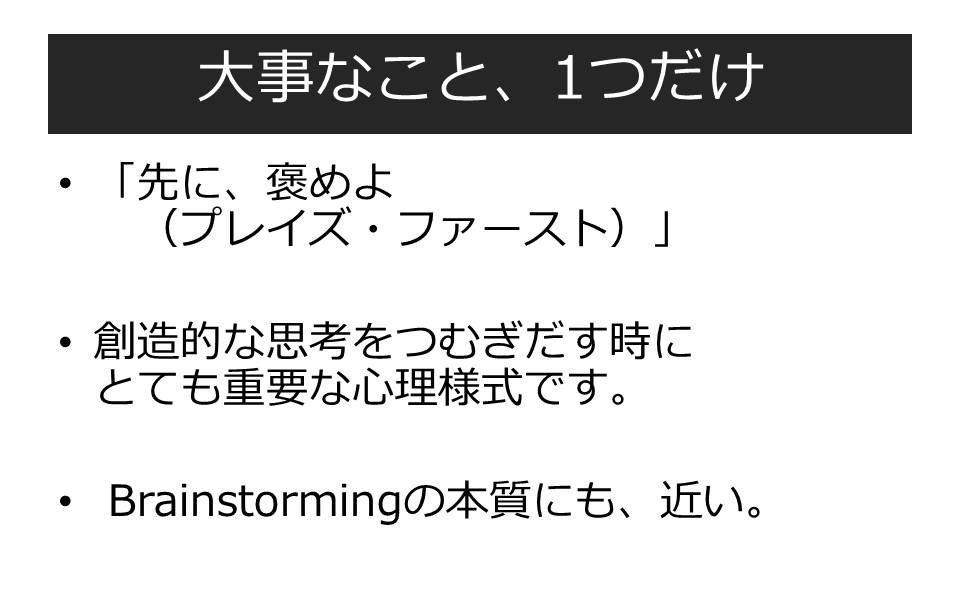 内容は、準備していた講義スライドの【1】【2】【3】と【6】をやりました。特に【6】「プレイズ・ファースト(先に、褒めよ)」。これを、創造的能力を引き出すときには、ぜひ重視してください。それだけで、多くの創造的な本来もつ能力は、使えるようになります。