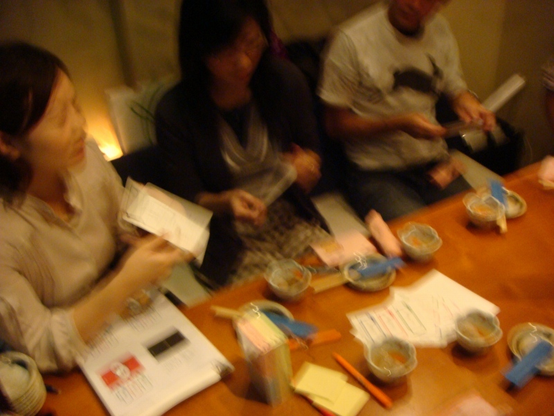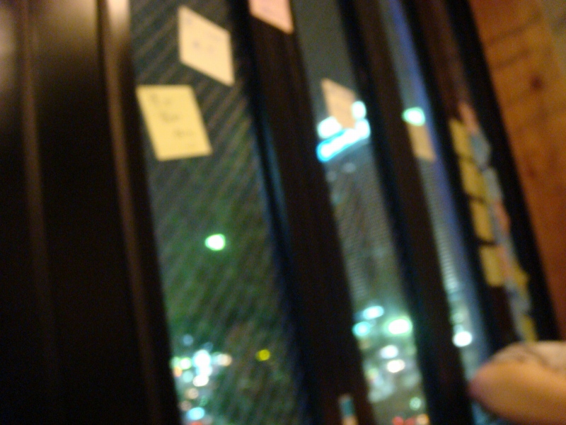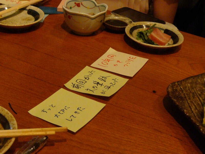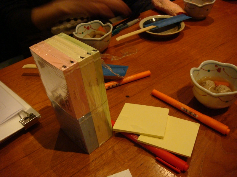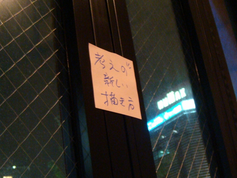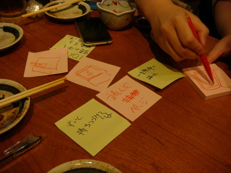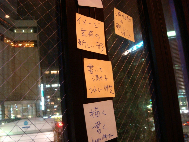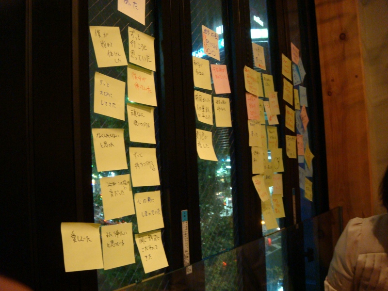 そして、ここは、恵比寿駅のすぐ目にある居酒屋の3階で、この窓の下には恵比寿駅があります。ポストイットの張れる空間として、大きな窓のある店を選ばれた模様。ところで、これ、地上階で外から見える席だったら、そうとう通行人に興味持たれたでしょうね。なんかそれだけでも、いろいろ、イベントとか、企画を思いつきそうです。