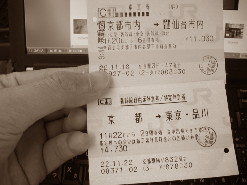 ■仙台―東京、東京―京都の新幹線特急券(自由席、片道)