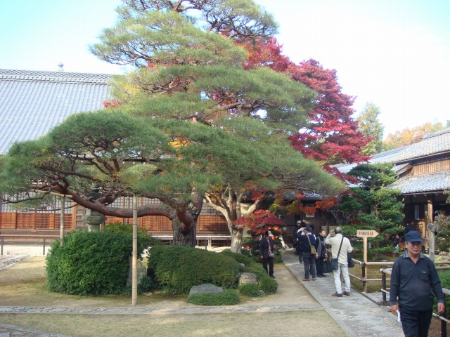 大きな松が添え木で広々と枝を伸ばし、奥には立派な紅葉が。左手から建物の中に入ります。