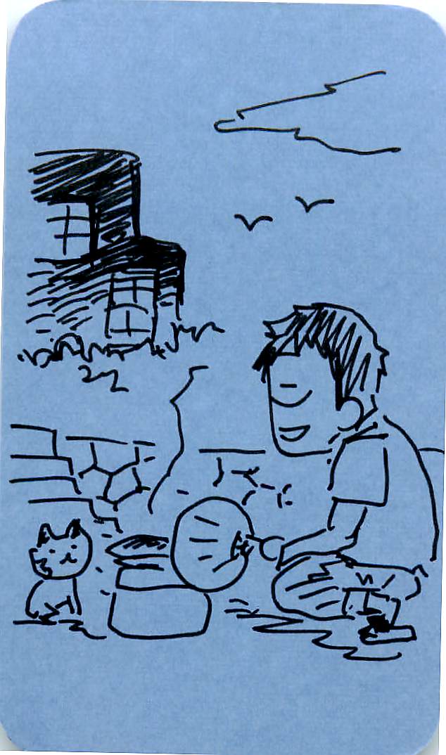 ・夕暮れの、寂れた研究等の軒先で、猫と七輪を囲む。
