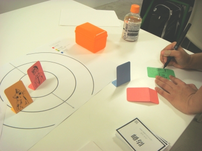 この発想方法は、「一点から、お話の、世界を拡げる」という思考様式を、視覚化したようなもので、ボードゲームテイストな教材を作り実践しました。