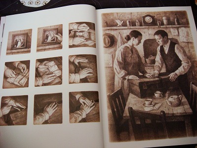 最終的にどうなるのか。それは、本を読んでのお楽しみにしないと、作者さんに対して不義理でありますし、読書のたしなみにも外れますので書かないでおきます。私は最後の方のページ(とてもぼかした上の写真)を、ずいぶん長いこと眺めていました。何一つ文字情報のないそのページを、繰り返し繰り返し読んでいました。行間を読む、という言葉でいうならば、行間を読むことしかない、すごく感性的な本です。その最後の行間には、私にはとても饒舌に語られているように見えて、もうそのページを見ながら、したであろう会話、そこにいる当事者の顔、周囲のそれを見ている通りすがりの人、素知らぬ顔で行きすぎる動物、そんなものが頭の中でしばらく再生されていました。絵がない「小説」には、その世界を想像するイマジネーションの力でしか人々を生き生きと動かすことはできませんが、この本も似ていて、文字は一切なく絵しかないのですが、その世界を生き生きと動かすイマジネーションが非常に、ぐいいっと強制的に始動させれてしまう、そんな素敵な本でした。