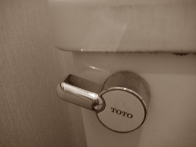 緊急以外は流さぬこと、と書こうかと思ったのですが、これがあれば十分だなとおもいやめました。赤いラベルで白い陶器に映えて目立ちます。視覚的にはこんな感じに意識がいきます、というのを表現したくて、ラベルらへんだけをカラーにしました。