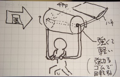 そうなったら、個人的には、キャスターバッグや、車いすの上にそれが付いているような産業用ともあっていいなと思うのです。駅の階段で、そのローラーを付けた車椅子を上までみんなで運ぶ時に、階段の下から扇風機で風を送り、巻いておいたゴムでローラーを回し、少ない力で車いすを持ち上げていくよな用途がないだろうかと。(大きな構造物があることであおられる不安定さが、この図の方式だとありそうで、その辺は何か改良のよりがあります。(そして、非常に強く、軽く、安全なこの構造が作れたら、微風でも人間が垂直に浮上するような、たけこぷたー相当のものが、できないかなぁと、連想的におもわなくもないのですが)