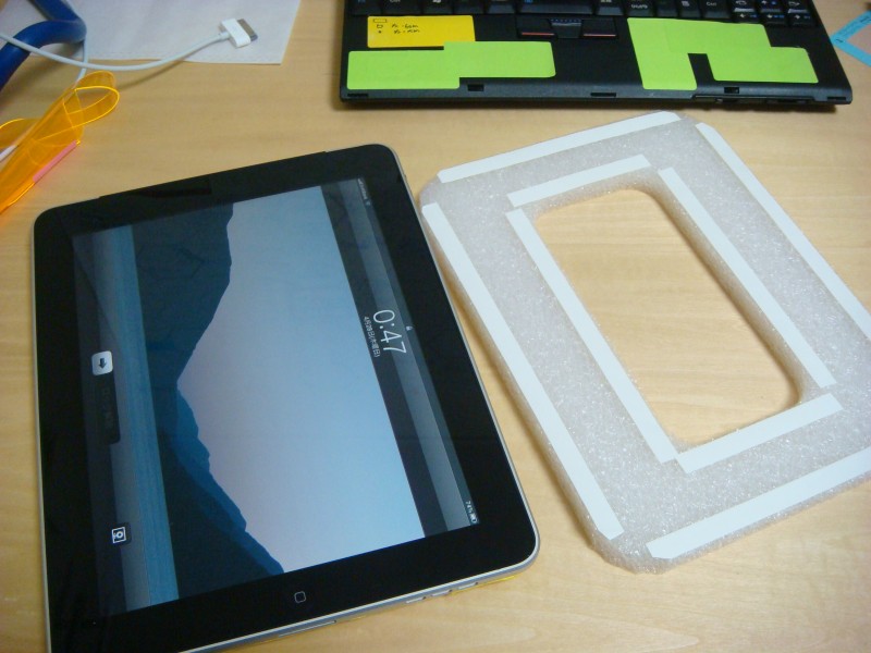 そして、アップルの修理から戻ってきたときのiPadのためのスポンジがまだ、机の上にありました。