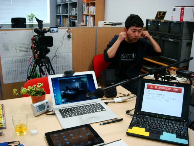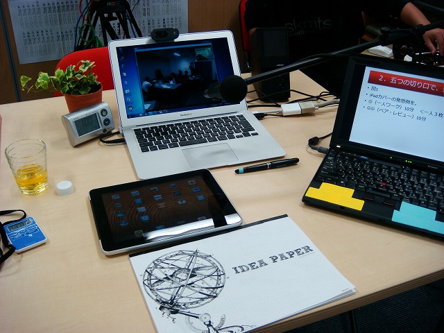私の手元には、スカイプの動画を出しているMac Book Air(大上さんのマシン)と、スライドの操作に慣れているThinkPad(私のマシン)と、時計やらツイッターやらを確認している、iPad、それから、メモを取ったりするノートがあります。