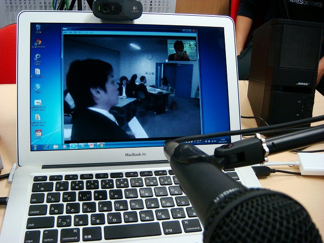東京側は、PCとカメラとプロジェクタがありました。画面に映っているのは、東京側で運営をしてくださった矢吹さん(Lproの社長)。横を向いているのは、そちらに、スクリーンがあり、私の顔が写っているので、自然と向うは、横向きに。(この点は、参加者の方が、自然とスクリーン向きにしゃべってしまい、声の拾いにくさにつながりました。基本的には視線の誘導先にマイクがある方がいい、と気が付きました)