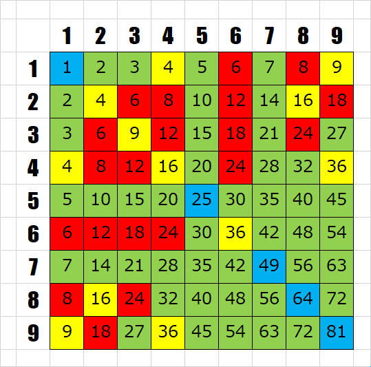 最後に、九九の表そのものに、出現回数の色を付けてみたものを載せておきます。