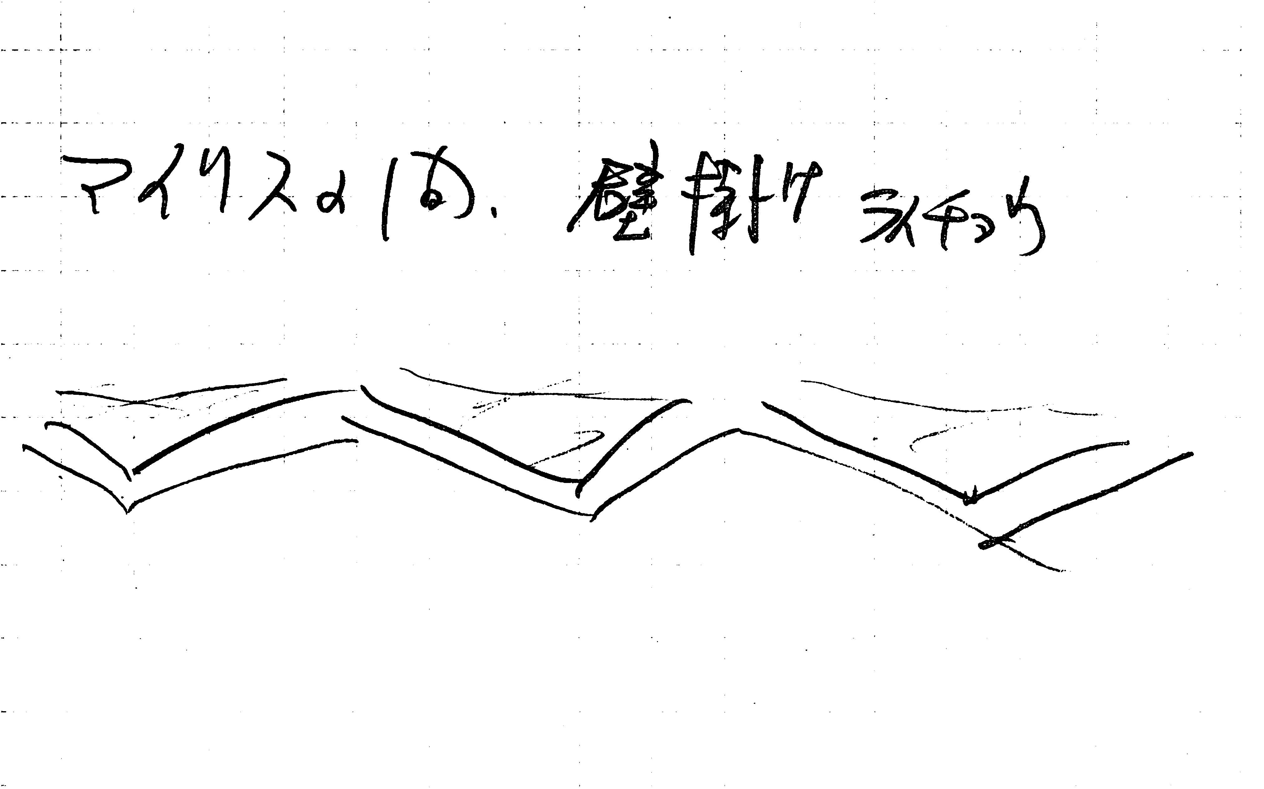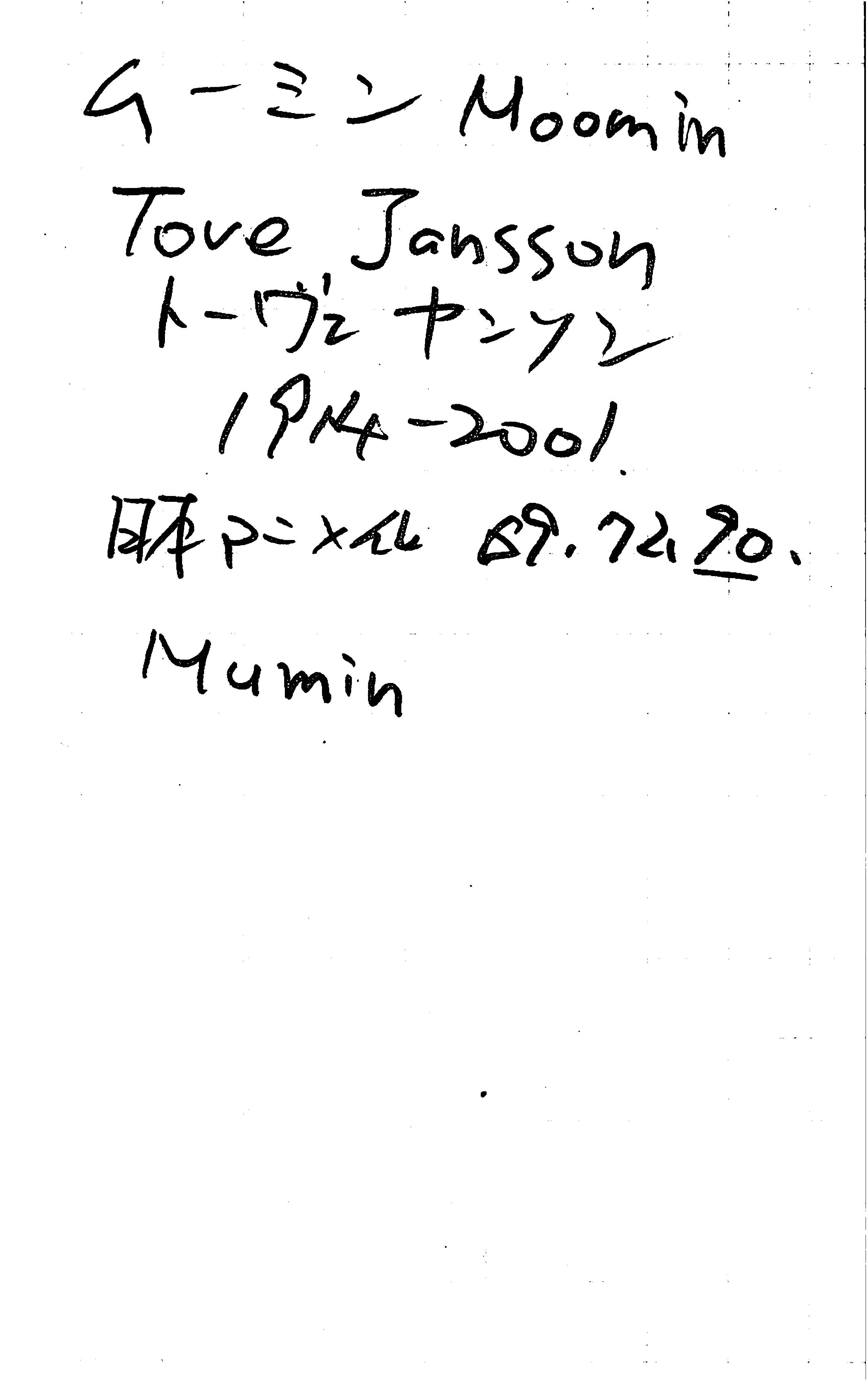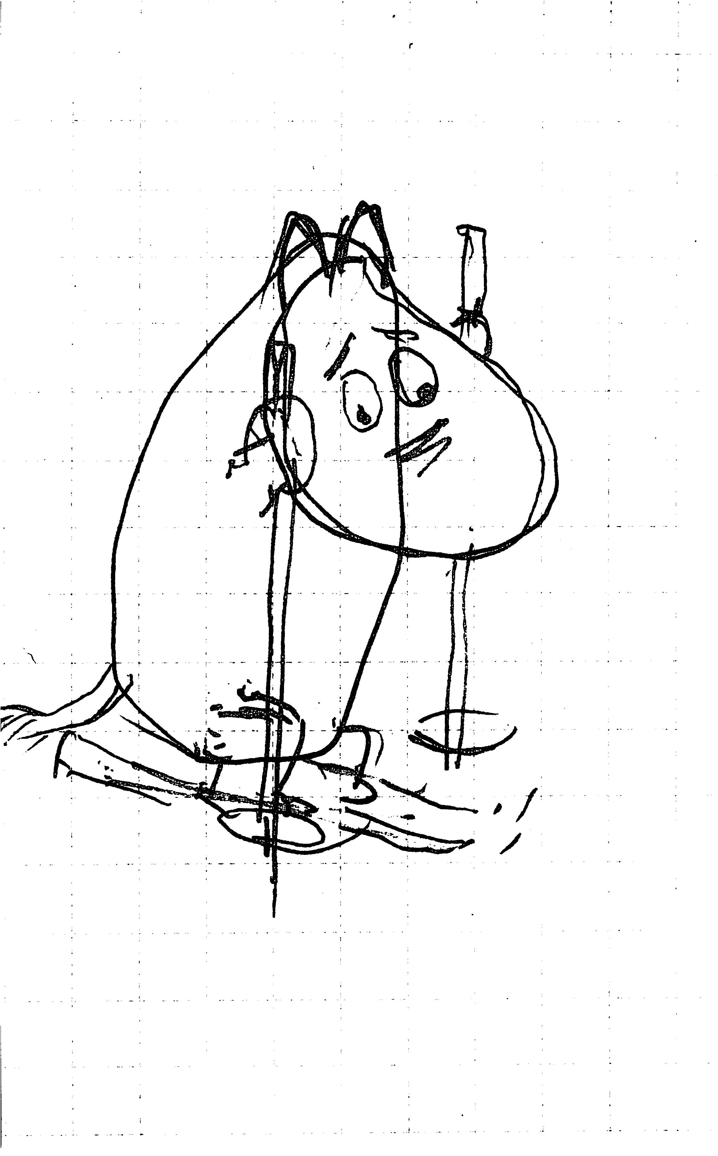 トーヴェヤンソンのスケッチを書きとったもの。大きな雪の丘を前にムーミン困りげ。
