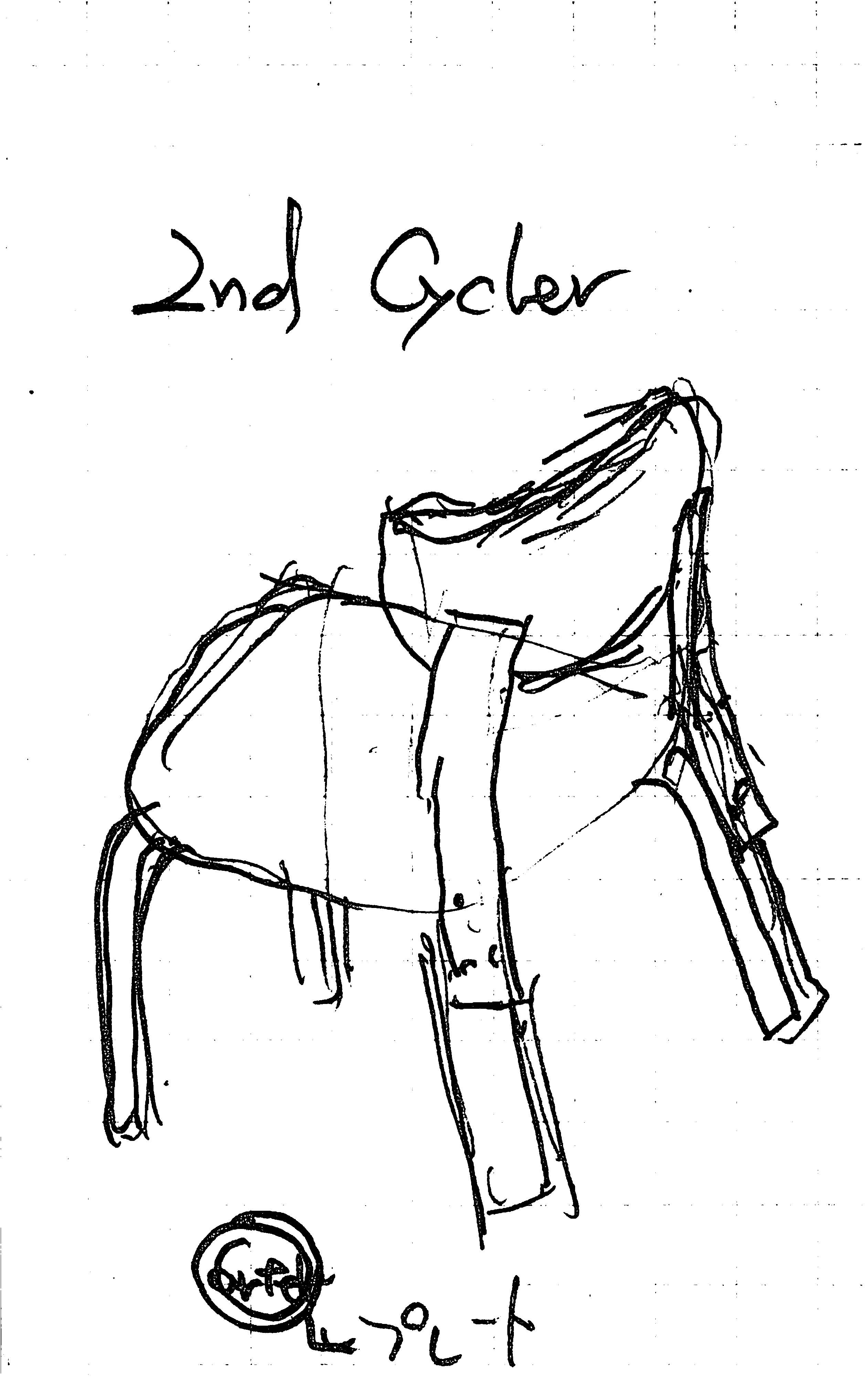 座面背面は、4センチ幅ぐらいの感情な布の帯を交差させて構成。座れるので座ったらなかなかのすわり心地。これも欲しくなる。