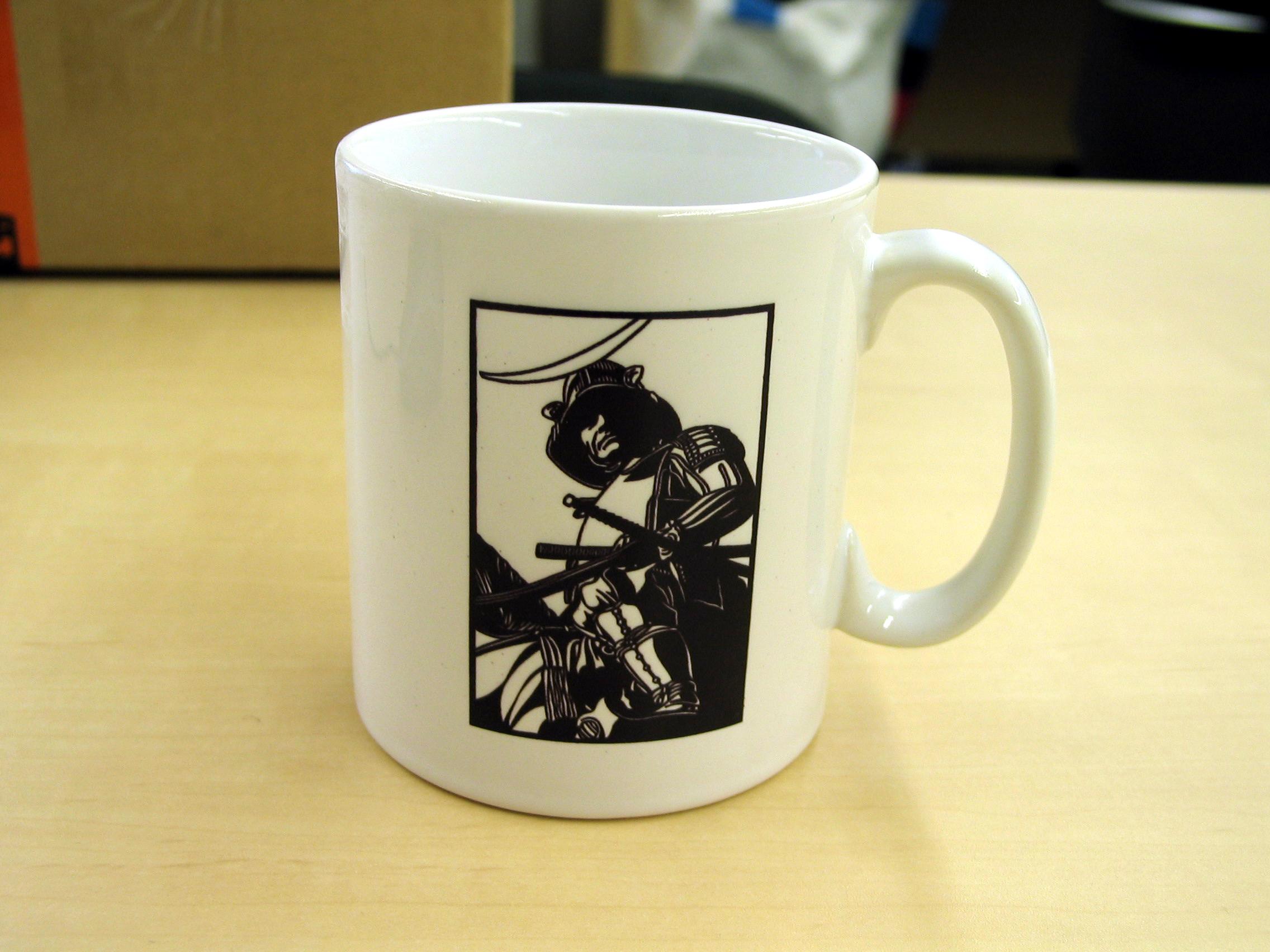手ごろの大きさの白いマグカップに、アップロードしたデザインがくっきりと印刷されています。白地に黒一色の切り絵が映えます。しかもマグカップのそこに刻印された産地を見ると、MADE IN ENGLANDの文字が。私には陶器のよさが良くわかりませんが、そう思うとそこはかとなく素敵な気がします。