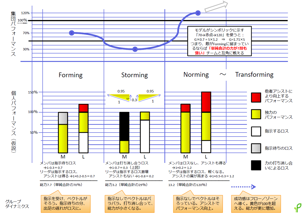 - 形成段階は、リーダ以外は皆、指示待ちです。出足が遅くなるので、勝負時の能力30%ダウン。リーダも采配を振るう負担が結構あって50%ダウンなるものの、他のメンバーを駆使して協力的な仕事ができるので、少しアップして、合計としては30%ダウン。このチームは本来の力の0.7の出力になります。