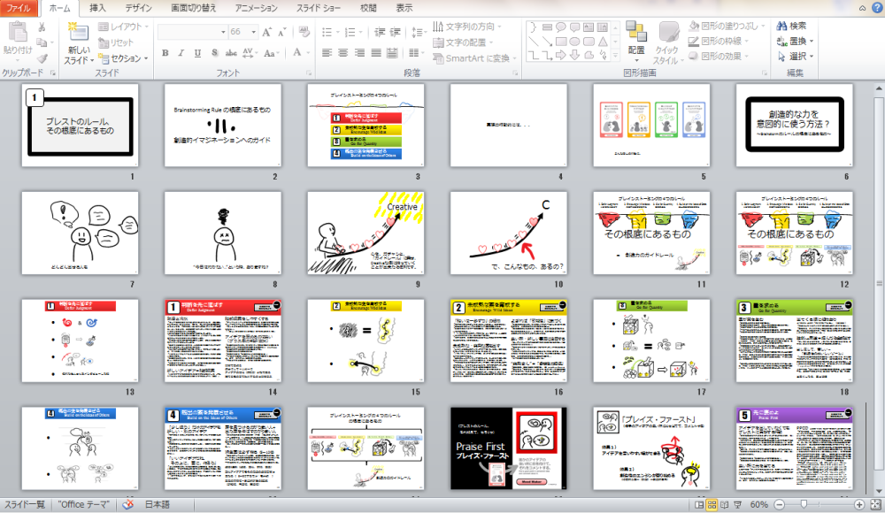 それらは「4枚スライド+ホワイトボード板書」という講義が徐々に発展してそうなったものです。研修に出れなかった人にも伝えたい、という方(多くは研修企画部さんなど)から依頼を受けて、板書の内容(ストーリーっぽくしゃべること)を、スライドにしてしてきました。