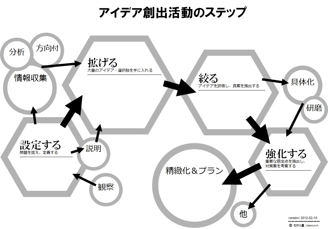 2016.02.18 研究(創造工学)/発表論文&スライド アイデア創出のステップ(2016版)アイデア創出のプロセスを、古今東西の発想技法・創造技法から集めて、切り刻んで、体系的ステップにしたてると、こうなります。これは、博士課程に在籍した時代に作り、これまでに何度か更新・公開しています。数年ぶりに更新しましたので、掲載しておきます。導入のお話(スライド)を含めて説明するときは、こうなります。以下。 従来からの変更点:◎ 【収束】と【強化】の間、(具体化)の次の所に、(研磨)を加えています。 « 経済産業省(東北局)のシンポジウムでパネラーをしてきました 原稿を書く »