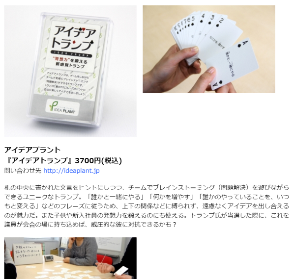 アイデアトランプは、その中でも記事のトリとして、発想力のトランプ、として紹介してくださっています。ありがとうございます。