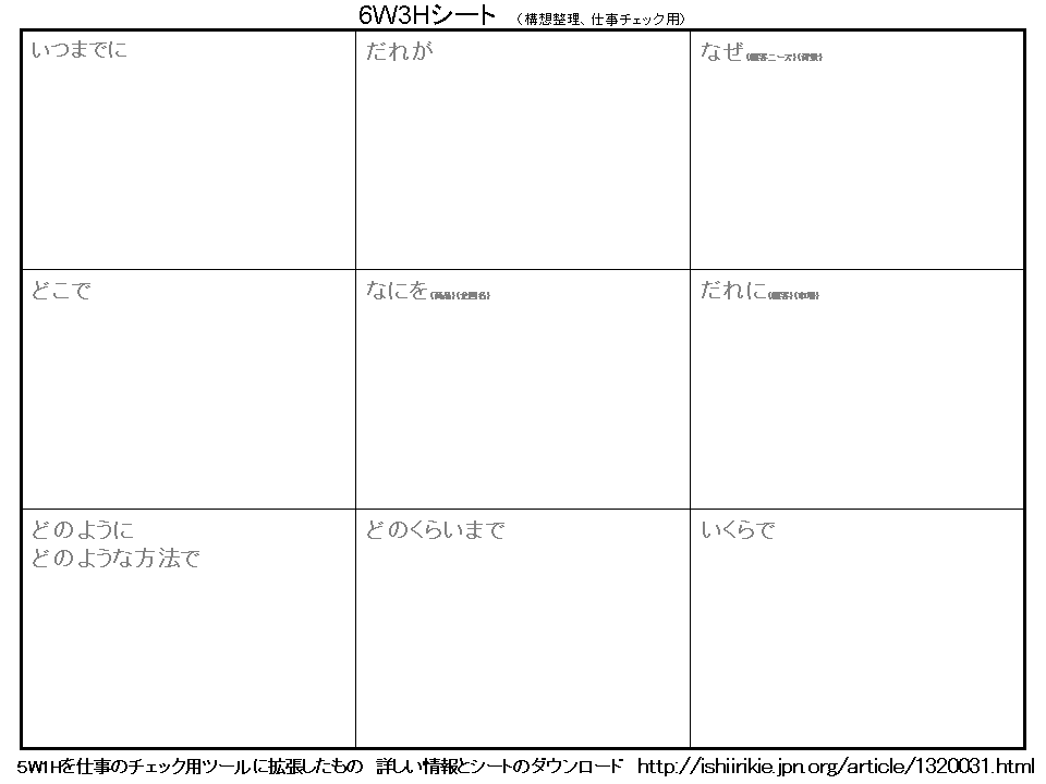 仕事の依頼を受けるときのチェック項目を、5W1Hではなく5W3Hとしているケースがありますが、ここでは、さらにWが一つ多く、6W3Hを採用しています。