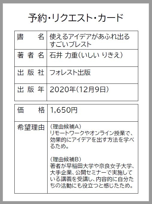 ぜひこれを、プリントして、ポケットにねじ込んで、図書館などに行った際に、そこのリクエストカードに書いていただければ幸いです。