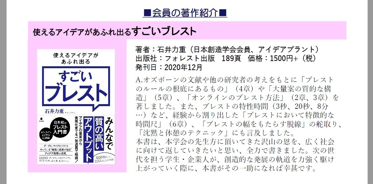 2020.12.30 『すごいブレスト』2020年 学会のニューズレターで『すごいブレスト』が紹介されました創造性の学会である日本創造学会の12月のニューズレターで、拙著が紹介されました。謝辞(おわりに)でも述べましたが、学会の大先生や諸先輩がたからいただいた知見や研究結果や機会に助けていただき、今があります。その恩を広く社会に返したいと思い、全力でブレストの手ほどきの本を、書いてみました。この場を借りて、御礼申し上げます。ありがとうございました。 « 【WASEDA NEO】リモート・ブレストが楽しく捗るスキル【オンライン講座】1月21日、28日、2月4日(19:00~) 年末考「蒸発した市場は、今までなかった場所に、新産業の雨を降らせる」 »