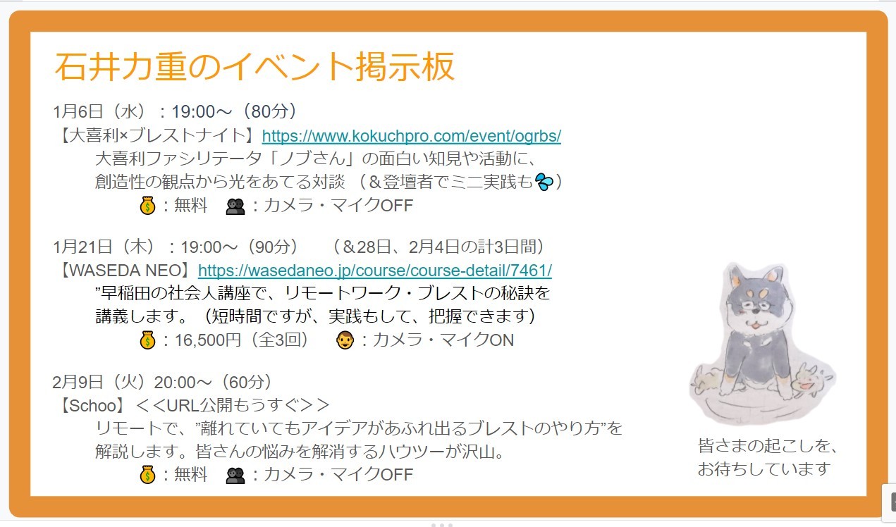 2021.01.05 アイデアプラント 5th(2018-2020) 石井力重のイベント掲示板(を作りました。)私の講演、ワークショップなど、イベント案内の情報掲載の場所を新設しました。これからは、このURL(Googleスライド)に直近イベントのリストを掲示します。↓開くとこんな感じです。 « ThinkPad Bluetooth Keyboard Ⅱ センターボタンが丸い形になる、の対処法を見つけた話 リモートでもアイデアがあふれ出すブレストFBS »