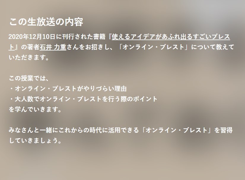 2020年12月10日に刊行された書籍『使えるアイデアがあふれ出るすごいブレスト』の著者石井 力重さんをお招きし、「オンライン・ブレスト」について教えていただきます。