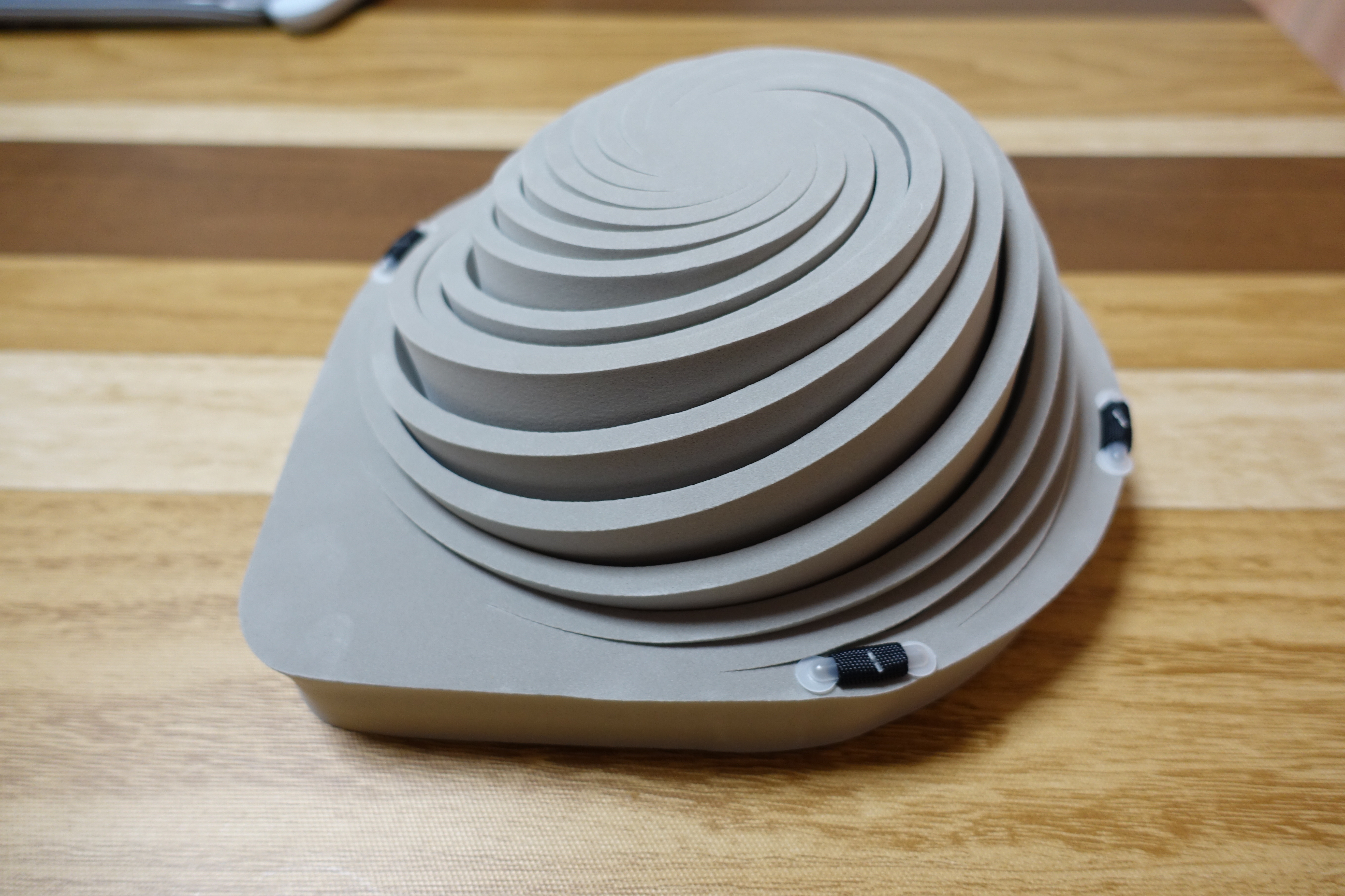 写真は防災テーマの際に、サンプルでお見せした「でるキャップ」。これ、結構あったかいんです。クッションスポンジなんですが、頭にのせるとグイっと出てきて帽子になるんです。防災頭巾より少し上の防御力です。