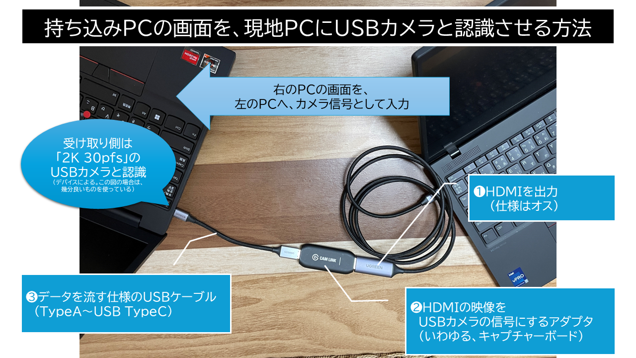 持ち込みPCの画面を、現地PCにUSBカメラと認識させる方法